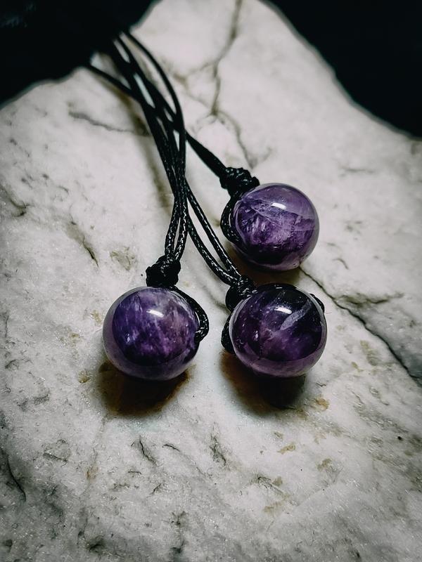 ▪️Минерал – натуральный аметист фиолетового цвета с многогранными красивыми прожилками, камни премиум качества ▪️Диаметр камня - 12 мм ▪️Основа - черный вощеный шнур, стойкий к влаге, износостойкий ▪️Длина регулируется по желанию ▪️Полная длина шнура +/- 66 см Аметист – широко известный камень талисман, пользующийся популярностью у поклонников литотерапии, эзотерических практиков, шаманов. Кулон аметист, магические свойства: ▪️усиление интуиции; ▪️отвод негатива от владельца; ▪️ способствует масштабному мышлению и мудрости, что помогает принимать верные решения в любых жизненных сферах; ▪️усиливает равновесие во время медитаций, практик; ▪️сохраняет женскую красоту; ▪️снимает стресс; ▪️ помогает найти и развивать таланты. Дополнительные характеристики: Материал : Камни