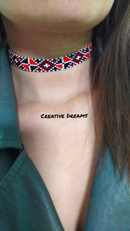 чокер ручної роботи виконаний з якісного чеського бісеру. довжина 28 см, ширина 1.5 см. довжина зав'язки 18 см. За деталями звертайтесь в повідомленні з радістю відповім