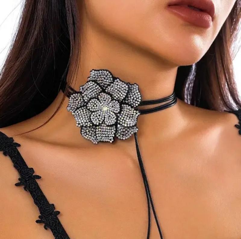 Чокер веревочный с большим цветком черного цвета с камушками