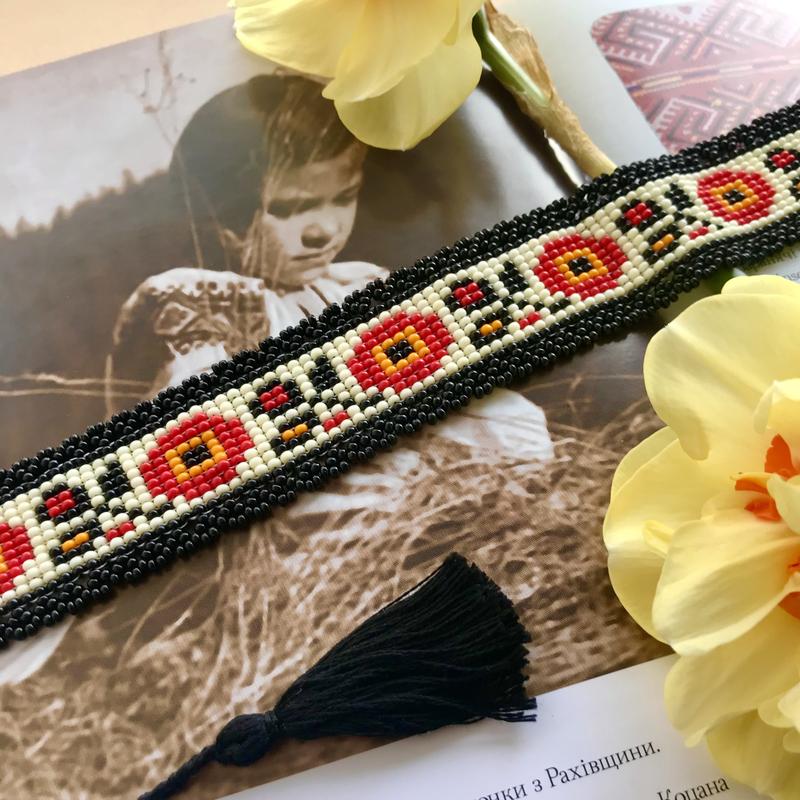 Гердан с узором из галической вышивки (с. Рыжие, Львовская область). Ширина 3 см, длина бисерного полотна 28 см. Завязки с кистями по 25 см. Возможна кастомизация: другие цвета или варианты крепления (застежка-карабин, тонкая или широкая лента).