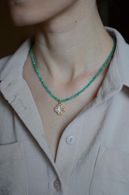 Хендмейд украшение на шею из изумрудных фианитов с подвеской клевер. Фианитовые бусины имеют особую огранку, что делает их необычайно блестящими. Подвес в виде клевера (конюшины) также украшен фианитами и вставкой из натурального перламутра. Основа чокера - ювелирный тросик, застежка карабин с позолотой. Длина 39 см + 5 см цепочка-удлинитель.