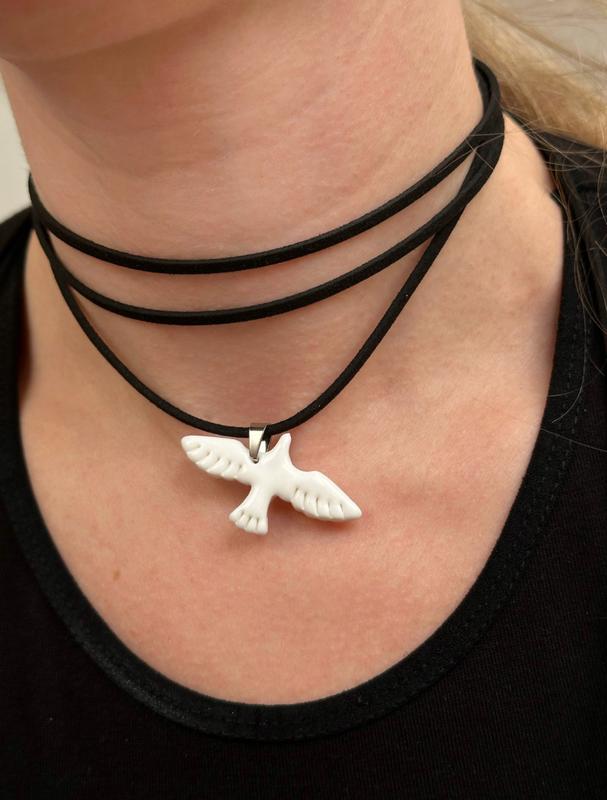 Трендовий та стильний чокер з кулоном-підвіскою голубка. У КОМПЛЕКТ ВХОДИТЬ 1 ПТАШКА ТА ОДИН ШНУР НА ВИБІР: БІЛИЙ або ЧОРНИЙ •довжина шнура - 150 (+-2) см. •матеріал птаха - полімерна глина (ручна робота), •лакове покриття (гіпоалергенне) •довжина розмаху крила - 4 см. •матеріал шнура - еко замш. •є багато варіантів носіння 🎁подарункове пакування, можна одразу на подарунок! Також є інші види пташок.