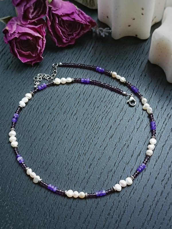 Очень нежный и элегантный чокер из граненых бусин натурального аметиста и белоснежных жемчужин барокко, который украшен ювелирной фурнитурой. Длина украшения: 41 см + удлинительная цепочка.