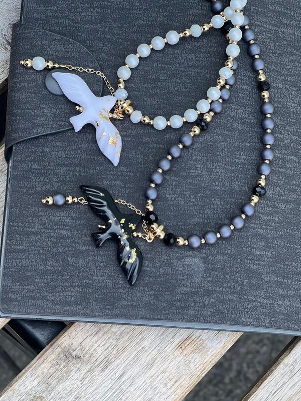 Длина 38-43см Чокер из искусственного жемчуга, хрусталя и гематита. Есть комплектные серьги и браслет Вся фурнитура гипоаллергенная со стойким покрытием позолоты Птички из полимерной глины