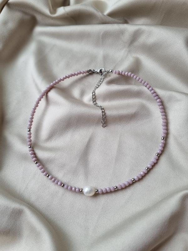 Чокер изготовлен из хрустальных бусин и вставкой из натуральной речной жемчужины. Все металлические элементы из нержавеющей стали. Длина - 32 см + 7 см застежка удлинитель