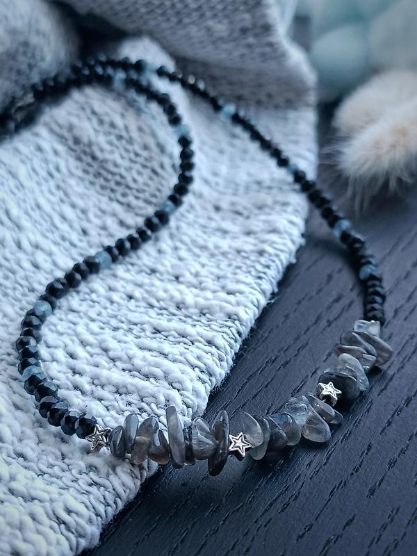 Очень изысканный чокер из благородного мерцающего лабрадора естественной формы и сияющей черной шпинели. Длина 40 см + удлинительная цепочка.