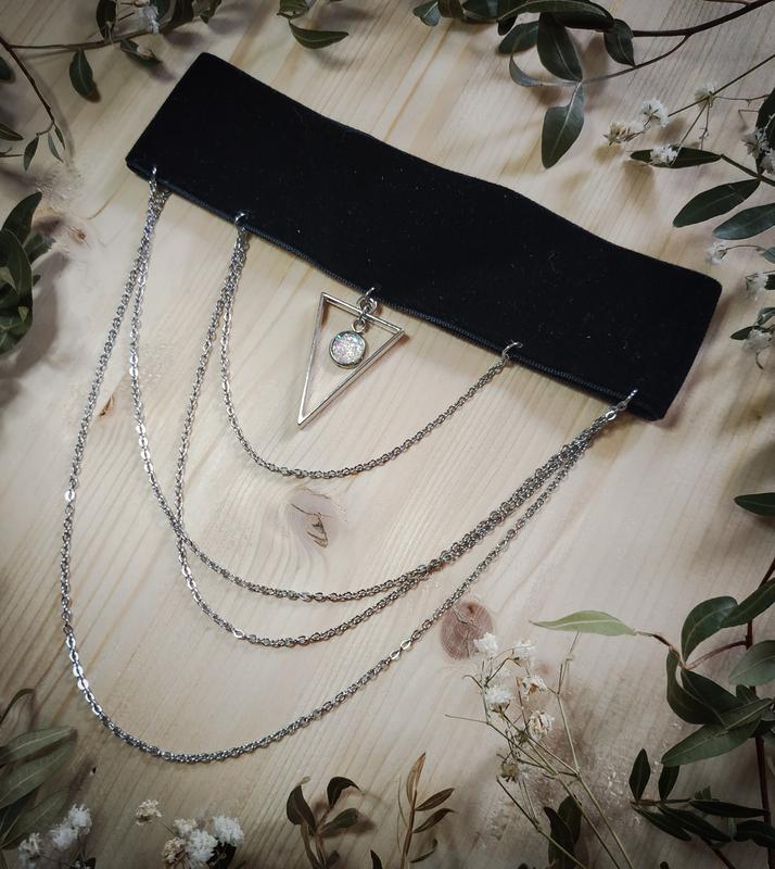 Длина ленты 32 см (можно добавить удлинитель +6см). Цепочки из нержавеющей стали, центральный подвесок - бижутерный сплав. Длина от верхнего края ленты до нижней цепочки, около 15 см. Стан новой вещи (работала собственноручно и ни разу не надевает).