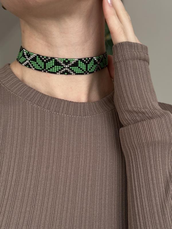 Этот изящный ленточный гердан из бисера в украинском стиле – идеальный выбор для особенных моментов. Его можно надевать как на праздничные мероприятия, так и на ежедневный образ, добавив ему ярких акцентов. Данный аксессуар подчеркнет твою индивидуальность и любовь к традиционному искусству.Стречечный грдан-чокер из чешского бисера на завязках. Ручная работа! длина (без учета косичек) - 31 см. ширина — 1,7 см. В комплект можно сделать браслет!