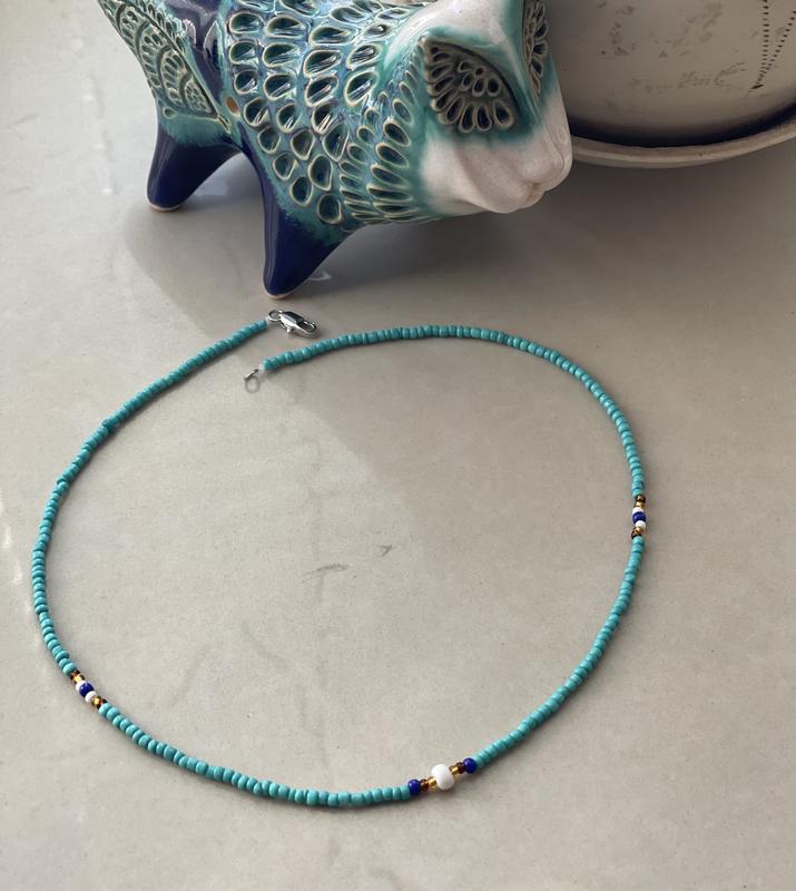 Яскравий чокер з бісеру кольору натуральної бірюзи, дуже пасує до відкритого літнього вбрання, гарне поєднання кольорів у виробі, зручна застібка.