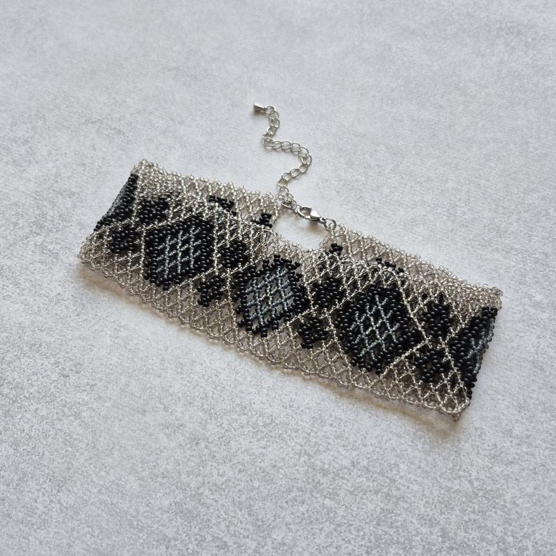 Чокер силянка с орнаментом из бисера ручной работы этно стиль гердан серый черный и серебр...