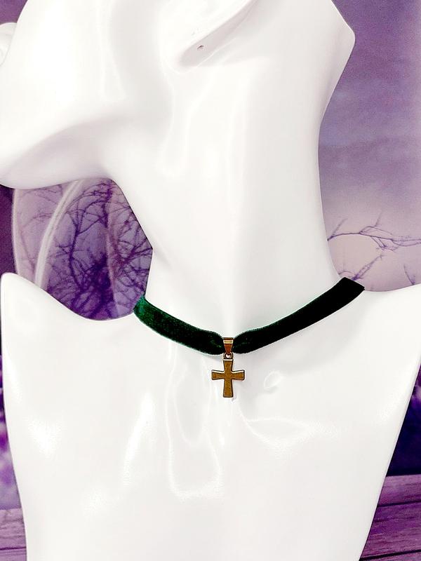 Лента бархатная изумрудная (чокер) с кулоном крестик - 2