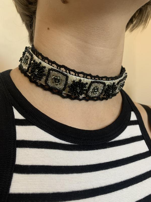 Довжина вишитого полотна 26 сантиметрів, довжина завʼязок 30 сантиметрів. Довжина виробу 86 сантиметрів. Ширина прикраси 3 сантиметри. Прикраса виготовлена з чеського бісеру, оксамитової стрічки, бавовняного мережива та ниток.
