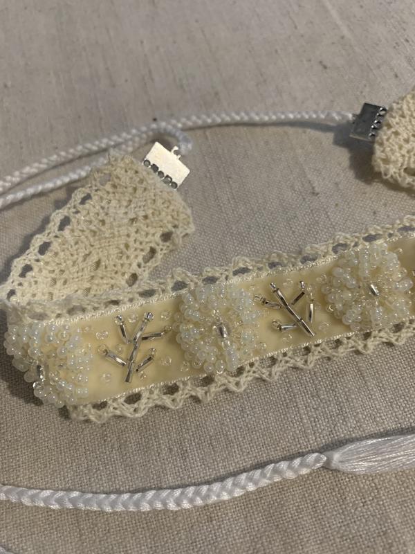 Довжина вишитого полотна 26 сантиметрів, довжина завʼязок 30 сантиметрів. Довжина виробу 86 сантиметрів. Ширина прикраси 3 сантиметри. Прикраса виготовлена з чеського бісеру, оксамитової стрічки, бавовняного мережива та металевої форнітури