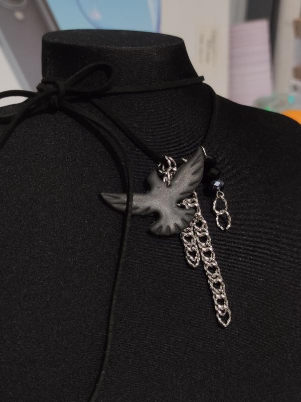 Подвеска чокер черная птичка горлица, украшение на шею с цепочками готическая, авторская б...