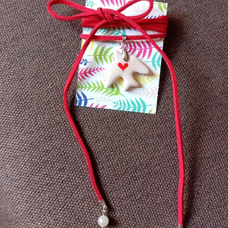 стильный чокер с красным шнурком птичкой из полимерной глины.