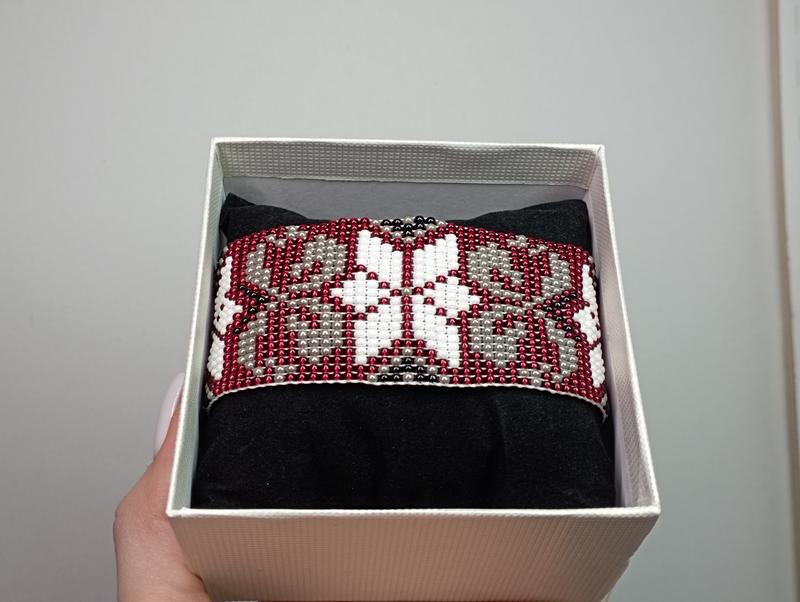 Женский чокер Сплетен собственноручно бисером высшего качества. Содержит украинский орнамент. Имеет в себе четыре цвета: бордовый, черный, белый и серый. Основа с узором 21см и боковые веревочки по 8.5 см.