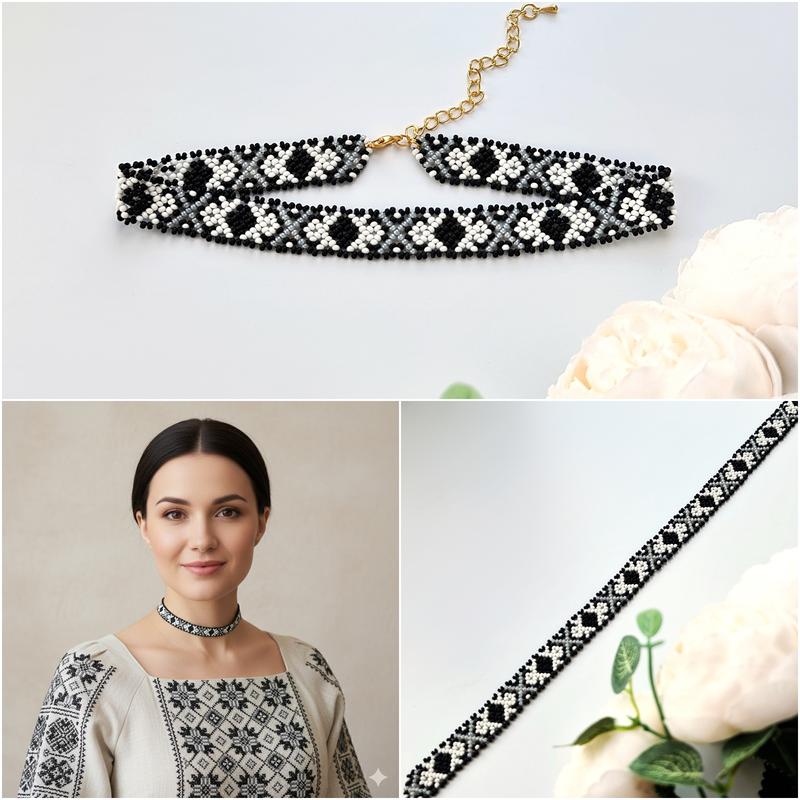 Черно-белый гердан чокер «Складные эмоции» по схеме старинной силянки Черно-белый гердан чокер «Складные эмоции» воссоздан по схеме старинной силянки из чатной коллекции Юрия Мелодикука. Автор схемы Lastivka UA. «Складные эмоции» — это как борьба между светом и тенью, где каждая эмоция находит свое место в этом черно-белом мире, а оттенок серого добавляет нюансов и многогранности. Ширина 1,5 см, длина 31-38 см, вес 13 г. Материал: чешский бисер Preciosa.