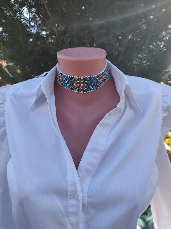 Стильный, яркий, современный чокер из бисера. Чокер мягко прилегает к шее и имеет удобные завязки, позволяющие регулировать длину в соответствии с индивидуальным размером. Украшение смотрится эффектно как с повседневными образами, так и с вышиванками или одеждой в стиле бохо. Длина чокера - 31 см и 25 см завязки, ширина - 3 см