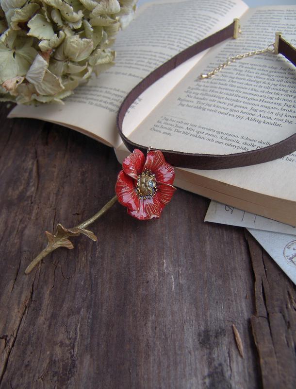 Чокер выполнен из натуральной кожи красивого коричневого цвета шириной 9 мм, с обратной стороны обработан тканью для более комфортного ношения. Цветок мака объемный, очень реалистичный, он подвижный, может показывать одну сторону, затем другую. Цветок выполнен из полимерной глины и покрыт ювелирной смолой, поэтому достаточно прочная. Среда украшена блестящим камешками, который красиво сияет на солнце. Длина чокера 33, 5 см + удлинительная цепочка 5 см. Фурнитура - нержавеющая сталь, поэтому она не почернеет.