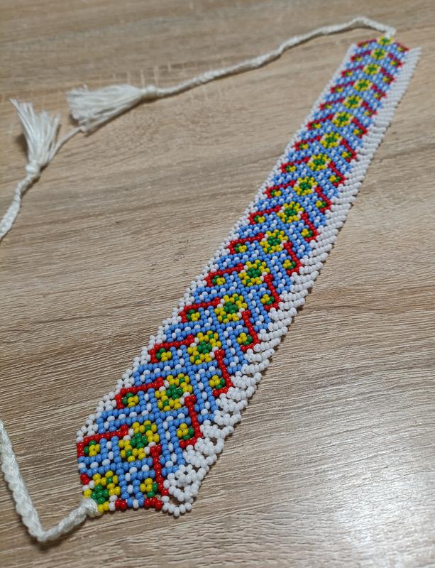 Яркий украинский гердан, сочетающий красоту традиционного искусства с современным комфортом ношения. Особенности: • Аутентичный геометрический узор в сине-красно-желто-зеленых тонах • Изготовлен из качественных материалов методом бисеплетения • Символ связи поколений и украинского культурного наследия • Регулировка длины благодаря завязкам Размеры: • Длина основной части: 29 см • Ширина: 4 см • Длина завязок: 24 см каждая Идеальный аксессуар для торжественных событий, народных праздников или как элемент повседневного образа с украинским колоритом. Подчеркивает индивидуальность и любовь к родным традициям.