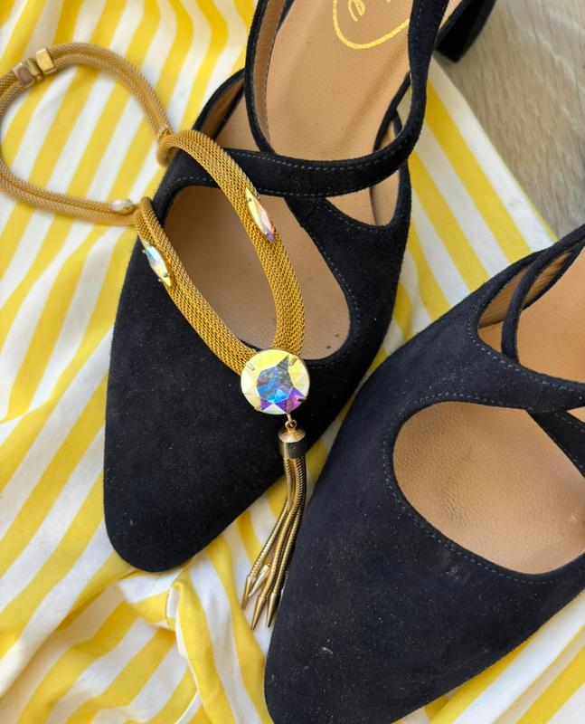 Це вінтажний золотистий чокер-боло -450📮 з мереживною та бахромчастою основою. Він прикрашений різнокольоровими стразами: одним великим круглим стразом по центру та трьома меншими, видовженими стразами, розташованими вздовж ланцюжка. Знизу звисає бахрома з чотирьох золотистих ланцюжків з металевими наконечниками. Чокер має регульований затискач для фіксації довжини❣️ Мають незначні сліди часу ❣️