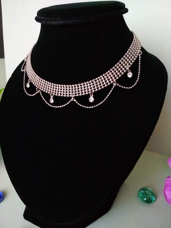 Стильный чокер . Аксессуар имеет застежку карабин и цепочку для регулировки ширины. Длина: 39,5 см.