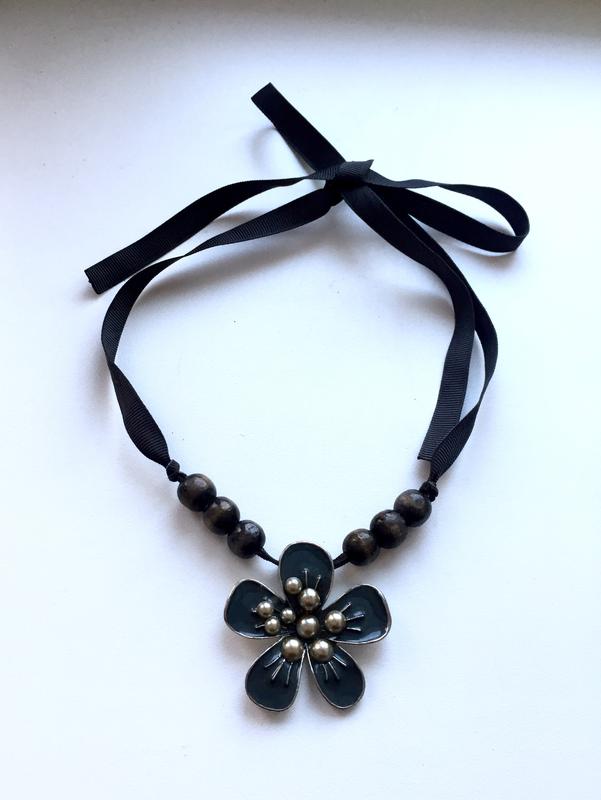 Об'ємний квітка з ювелірного сплаву на щільному атласній стрічці. Красива емаль і дерев'яні намистини.