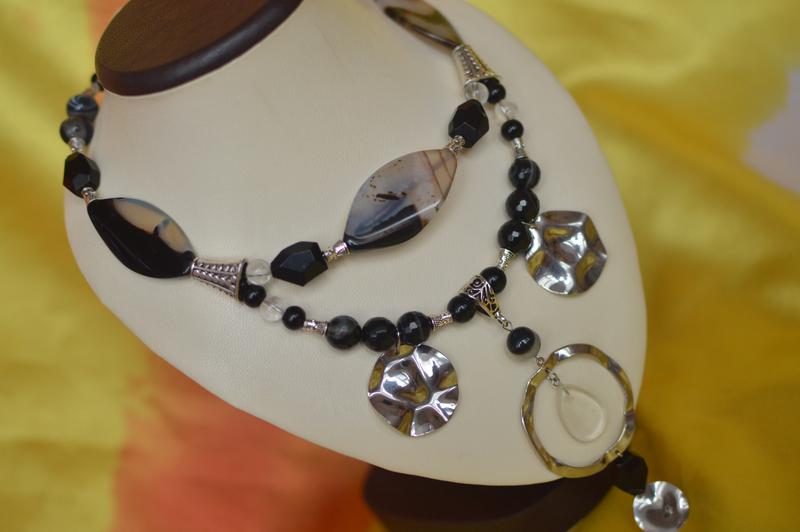 Эффектное массивное колье-чокер ручной работы сочетает в себе множество натуральных агатов разных видов, форм и размеров и горный хрусталь. Длина колье по шее 44 см, вниз 17 см. Есть серьги для комплекта. Лечебные и магические свойства агата напрямую зависят от цвета камня. Черный агат дарует людям большую внутреннюю силу, твердость духа, прочность морального состояния и материального положения. Черный агат - сильный оберег от темных сил и всяких катастроф. Отличная идея для подарка, ведь агаты, подаренные любящим человеком, становятся верным талисманом и надежным оберегом на всю жизнь!