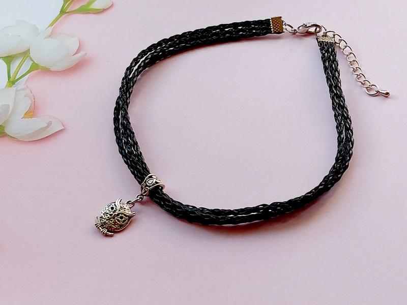 Мат-ли: 3 плетених шнура, штучна шкіра, 3 мм., чорного кольору. Підвіска "совушка", 2 см., фурнітура срібного кольору. Довжина 34 см. + 4 см. ланцюжок-подовжувач.