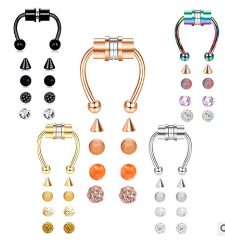 Изогнутая серьга в нос (ухо) из медицинской стали, магнитный зажим для пирсинга с магнитом пять насадок Пирсинг из нержавеющей стали, магнитное накладное кольцо для носа, кольцо в форме подковы, титановая сталь, искусственное кольцо для носа, неперфорированное кольцо для носа, украшение для носа Цена за 1 шт Никакого вреда для человеческого тела Цвет металла: серебристый, черный, радужный, золотой Основной материал: нержавеющая сталь