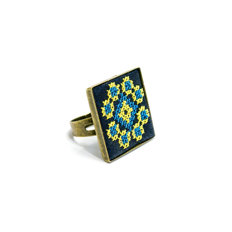 Вышитое кольцо Росава изготовлено из металла, тонированного под цвет латуни. Декоративная особенность кольца – вышитая платформочка размером 25х25мм, изготовленная из синего сатина и вышитая желтыми и голубыми нитями. Данное кольцо отлично компонует в комплекте с кросс-галстуком Росава, а также с вышитым браслетом и серьгами Росава.