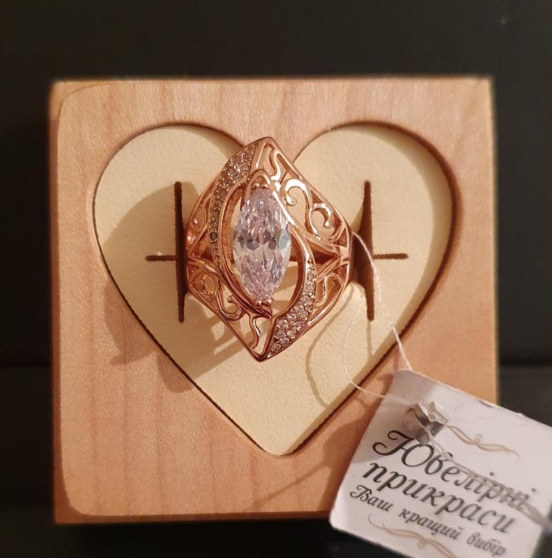 масивна каблучка з білим камнем вишуканий вигляд, виглядає дорого не втрачає кольору та не тьмяніє з часом. позолота 18К під рожеве золото.