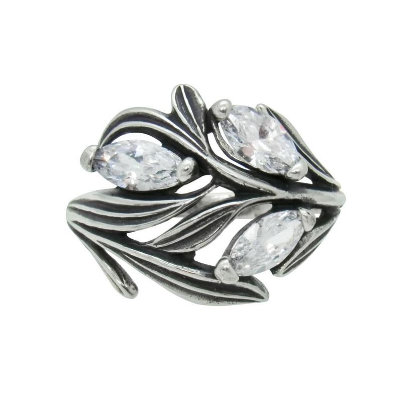 Крупное кольцо с листиками из серебра 925 пробы с фианитами. Приблизительный вес серебра 4,1 г. Все изделия проверены Пробирной Палатой и имеют клеймо государственного образца.
