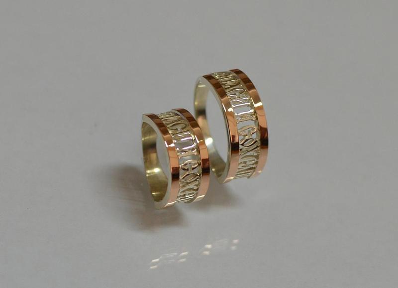 Пара обручальных колец с вставками из золота "спаси и сохрани"