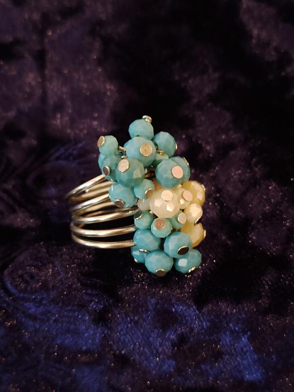 Каблучка ручної роботи, основа метал кольору срібла, кришталеві намистини бірюзового та бежевого кольорів