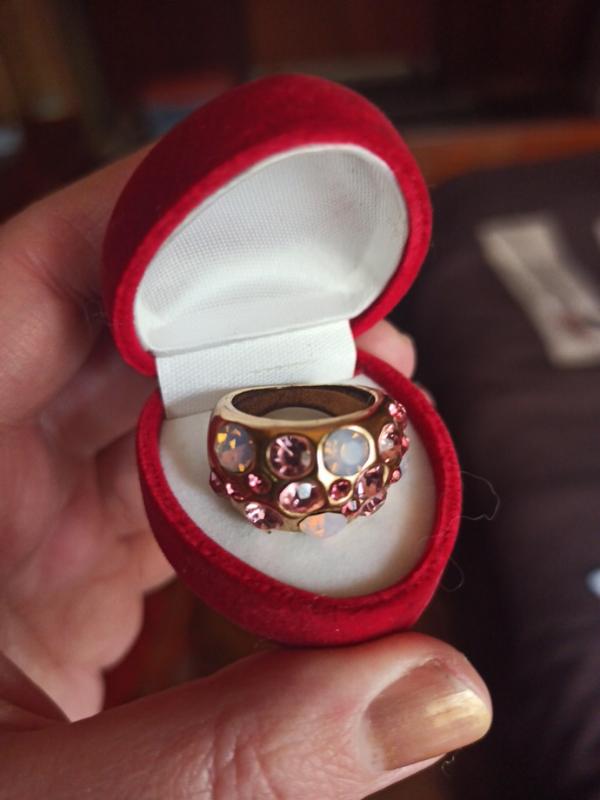 Замечательная кольца с розовыми и нежно фиолетовыми камушками. Диаметр 17 мм. Дочка носила пару лет.