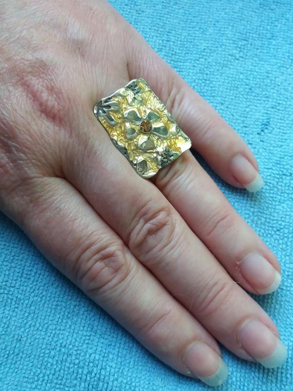Эффектное и необычное кольцо, напоминающее панно с цветочным узором. Размер универсальный. Фасад кольца покрыт прозрачной эмалью. Замеры фасада на фото. Винтаж.