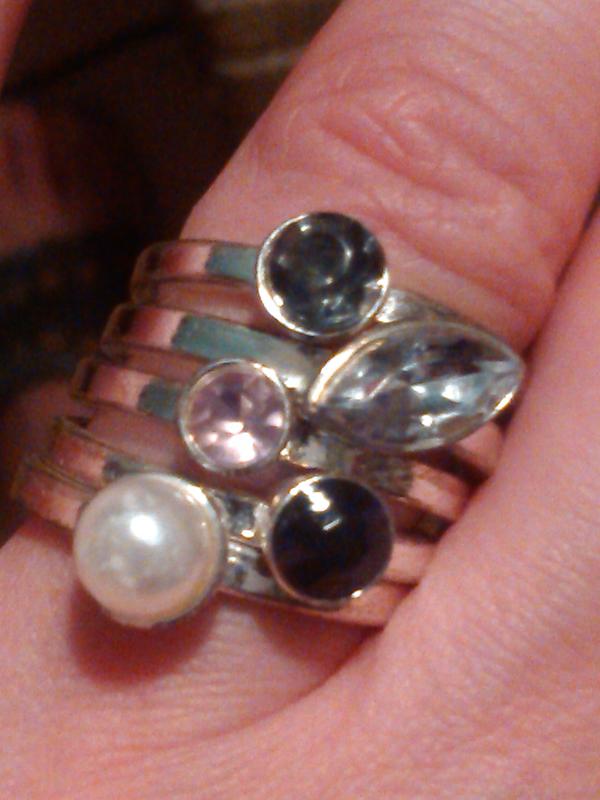 Прелестнейший набор из 5-ти колечек с камушками разных цветов, огранок, размеров и жемчужинкой. Вы можете чередовать колечки на пальце как вам угодно, можете надеть одно-два-три или все вместе, можете распределить по пальцам обеих рук - только ваша фантазия! Р.16, ювелирный сплав с содержанием серебра, покрыты белым родием.