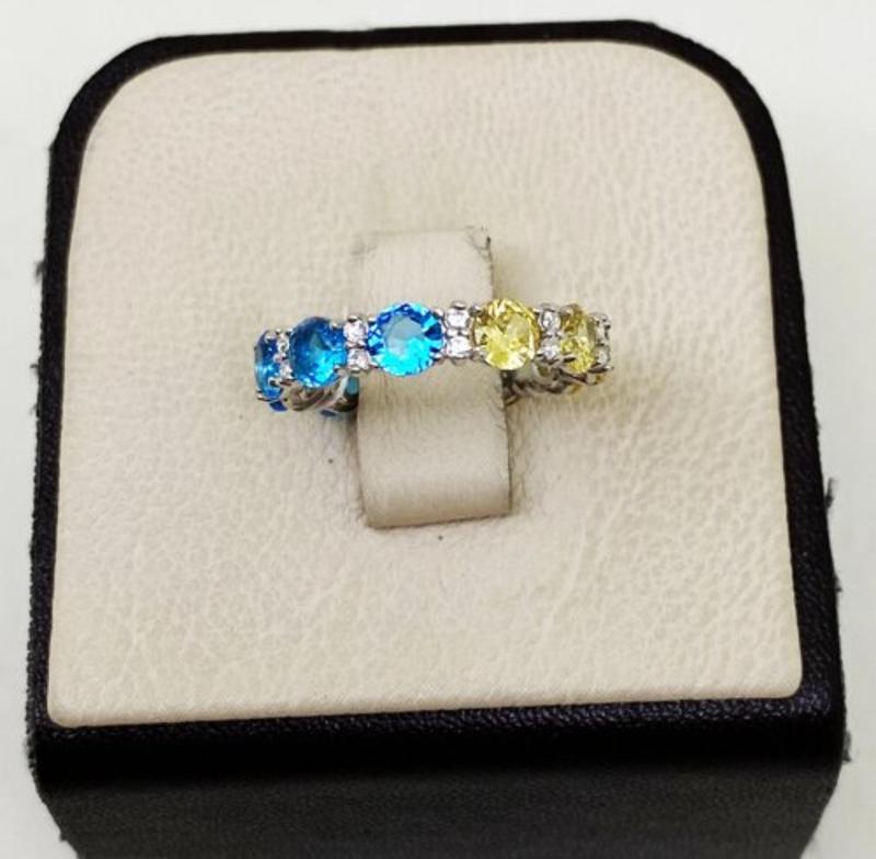 Каблочка серебряная, с желто голубыми камушками. Размер 17. Проба 925. Камешки кубический цирконий. В живую очень красивая.