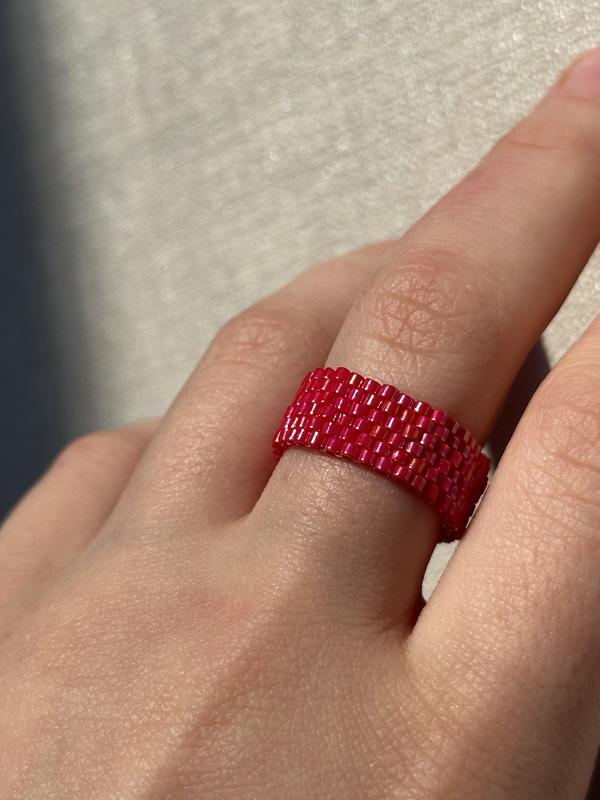 Невероятно красивая кольца, выполненная из бисера Miyuki Delica. Цвет кольца красный, но при разном освещении играет оранжевым и розовым оттенками. Данная модель идет на пальчик размером 17, но возможно заказ на ваш личный размер. Особенность данного бисера в том, что он не утратит свои свойства из-за влияния факторов окружающей среды таких как вода, УФВ и прочее. Также он крепко держит свою форму ну, а о его сиянии - речевом ✨ По всем вопросам писать в личные 😊