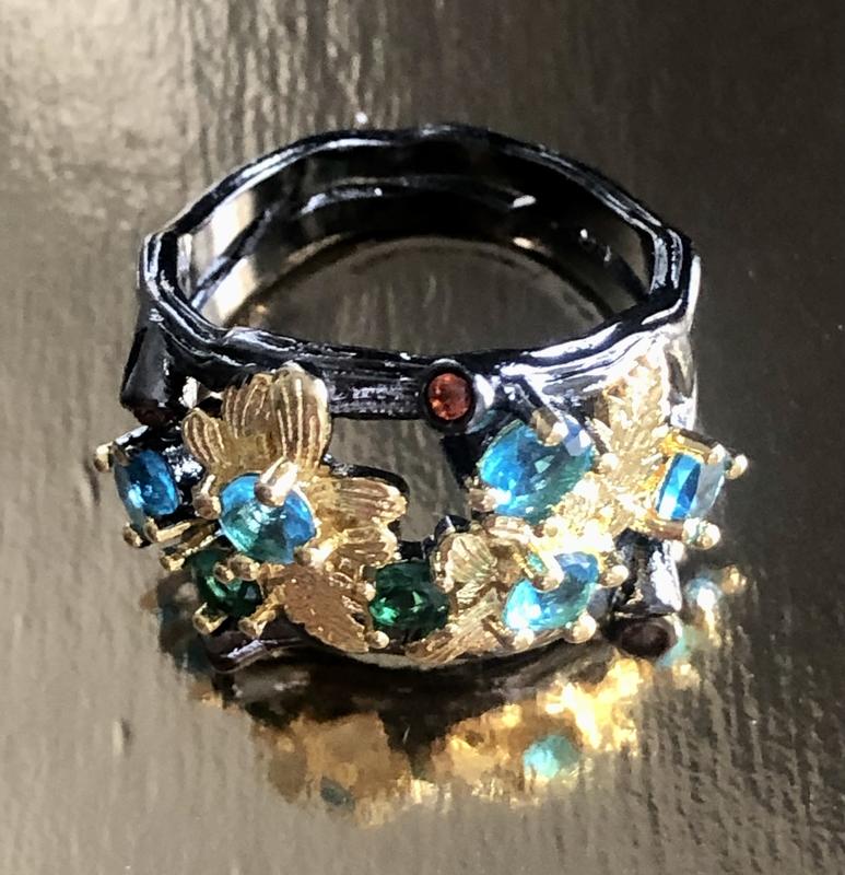 шикарный кольцо серебро авторская работа ювелира из Тайланда лимитированный выпуск. Размер 17. Покрыт черной гальваникой и золотом 18 карат. камней лабораторные турмалины. Выглядит очень эффектно.