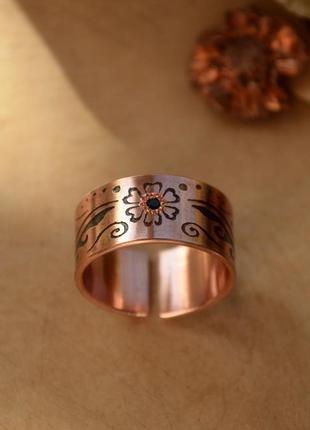 Медное кольцо с чёрным цирконием. Кольцо изготовлено из 100% меди, покрывается лаком по вашему запросу. Отличная идея для подарка Любимой женщине по любому поводу, особенно на годовщину Медной свадьбы - 7 лет супружества. Рисунок выполнен по авторскому эскизу методом химического травления. Цвет камня может быть любым на ваш выбор. Ширина шинки 10мм, размер регулируется в большую сторону, чтобы узнать актуальный размер кольца вы можете посетить ближайший ювелирный магазин и уточнить у продавца-консультанта. Эта услуга бесплатная, обратите внимание, что широкое кольцо садится на руку плотнее, чем узкое в этом же размере. Дополнительные характеристики: Камни / вставки : Фианит Материал : Медь Товар под заказ