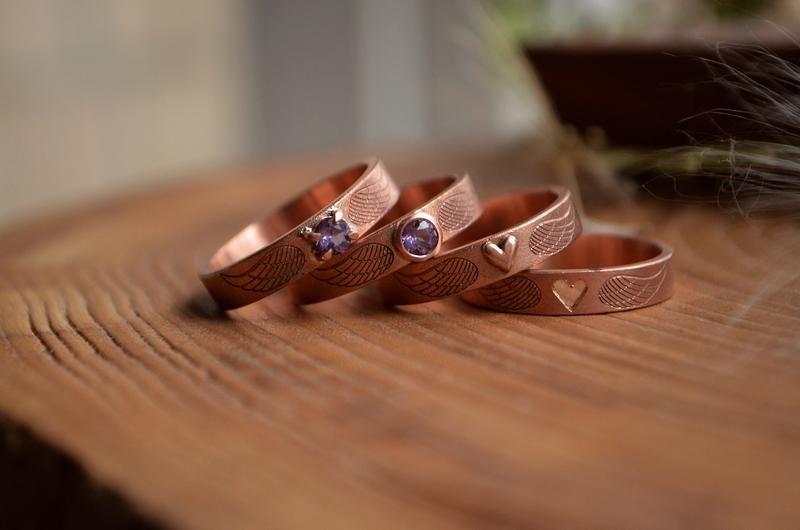 Мідні обручки з крилами. Чудовий подарунок на Мідну річницю весілля, 8 років разом. Вставки на вибір: аметист - фіолетовий гранат - червоний топаз - білий топаз - зелений топаз - синій цитрин - жовтий Можливе гравіювання дати чи побажання на внутрішній стороні обручки - від 300грн/шт Дополнительные характеристики: Цвет металла: Красный Товар под заказ