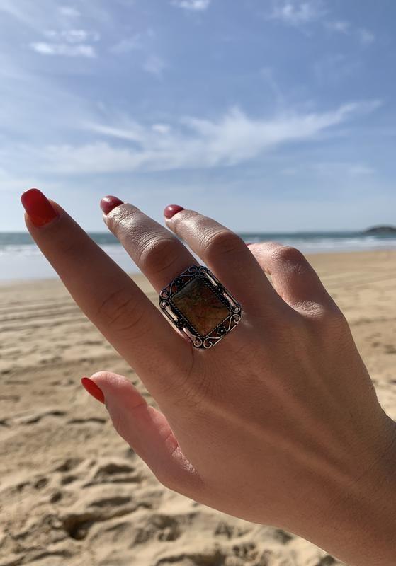 Колечко, перстень с натуральным унакитом. Размер кольца регулируется, 17-20. Материал - бижутерный сплав. Кольцо массивное, 2,3 х 2,7 см. Унакит — универсальный оберег, способный стать полезным другом и помощником для любого человека. Обладая мощной магией, камень никогда не спровоцирует внезапных перемен, но поможет сделать течение жизни более плавным, размеренным, уверенным и позитивным. Главное не слишком увлекаться его способностью дарить оптимизм, «блокировать» негативные эмоции и воспоминания, чтобы не попасть в зависимость от «розовых очков».