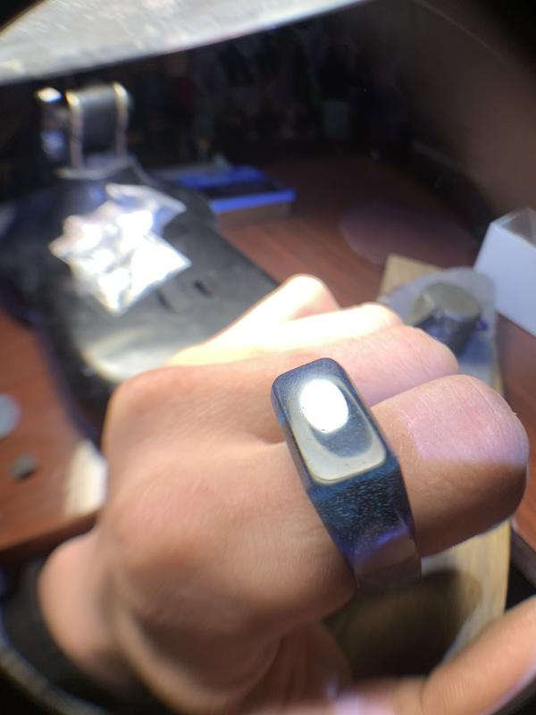 Изготовлен из мореного дуба и эпоксидной смолы с добавлением люминофора. Светится в темноте