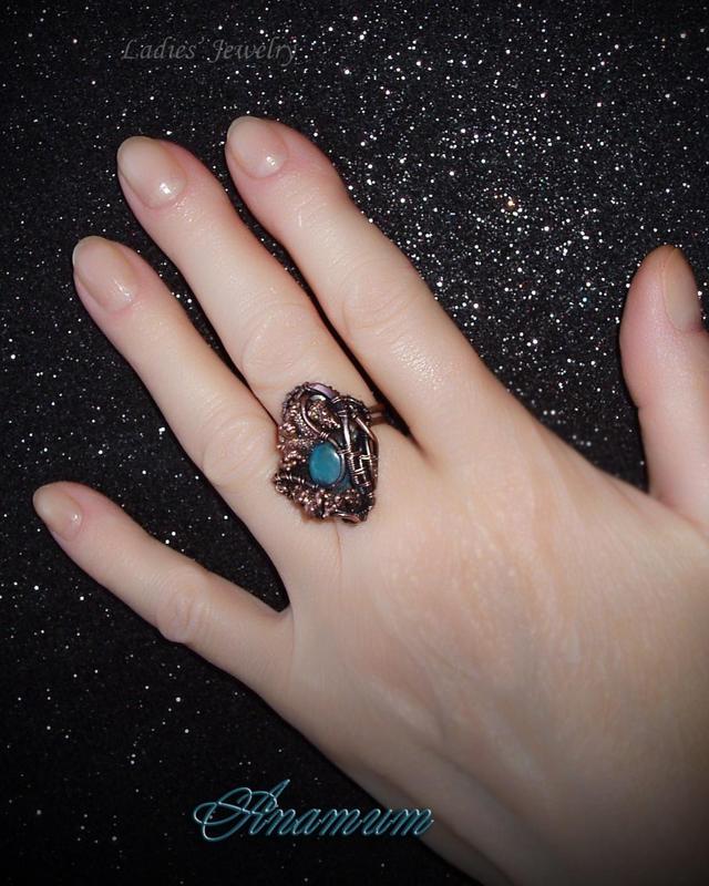 Кольцо с апатитом выполнено из патинированной меди методом гальванопластики и wire wrap. Размер 17.5+, регулируемый.