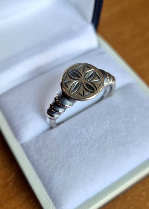 Перстень характерника. З огляду на схематичне зображення цвіту папороті, власник вірогідно мав стосунок до характерників або ж був носієм таємних родових знань. Є точною копією давнього перстня, знайденого по річці Сейм біля Батурина, орієнтовний вік якого ХVI-XVII століття. Фото оригіналу додані в опис. Матеріал — срібло. Доступний у 21 розмірі, можливе виконання під замовлення. 📐 Розміри: 21 ⚖️ Вага: 6.4 г 🚀 Україною перешлю