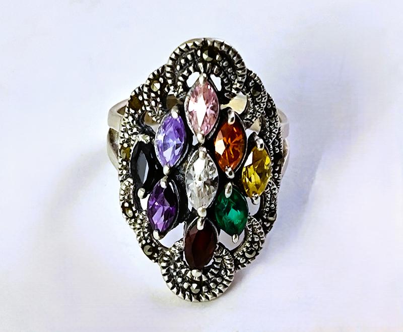 Привлекательное серебряное кольцо. 925 проба. Мультикамни. Размер - 17,8 мм. Вес - 7,63 грамм. Все фотографии актуальны, Вы получаете товар указанный в объявлении и на фотографиях.