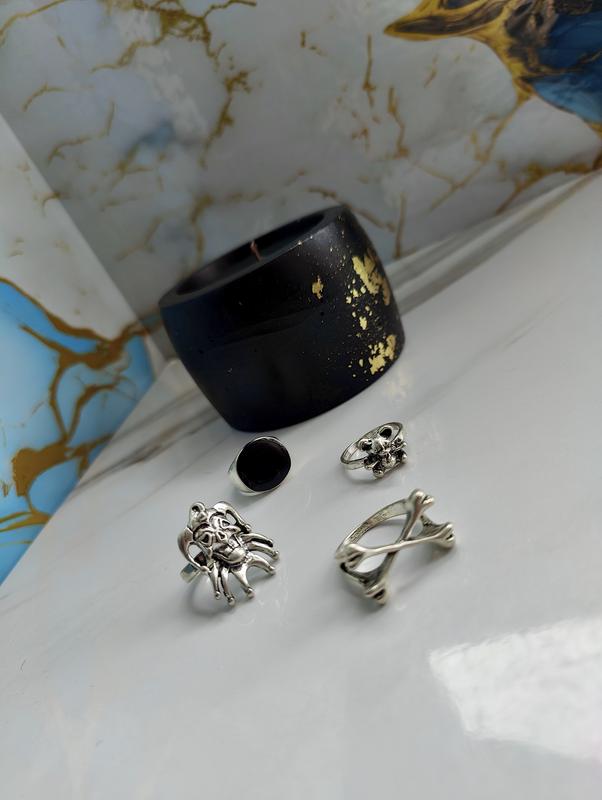 Набор колец из четырех штук. Размера коллочек в наборе 17-18. Тип металла: цинковый сплав. Цвет: серебряный. Код 4957.