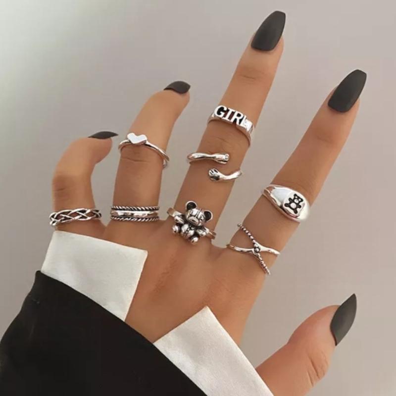 Набор колец 8 шт в стиле панк рок хип хоп гот кольца мишка сердце ручки плетёнка girl